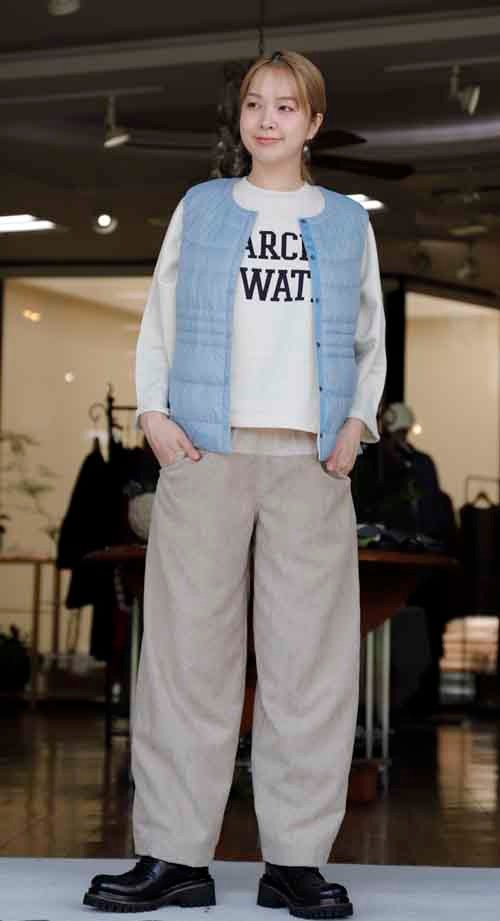 やや太い袖のロゴスエットとコーデュロイパンツと