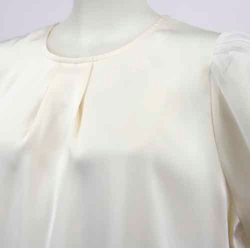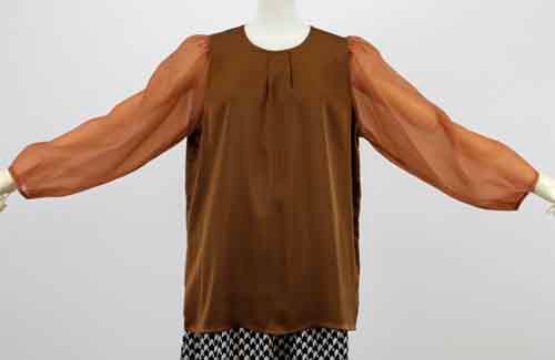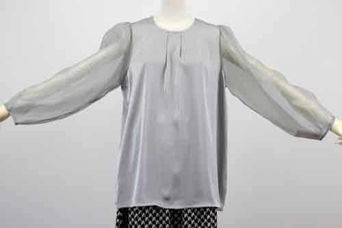 光沢サテンブラウスやチュール重ねのふっくら袖がいい。