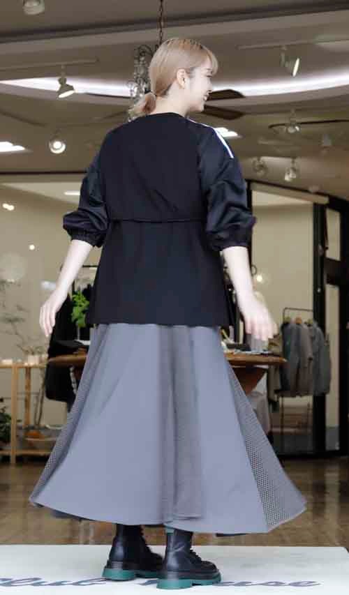 袖はライン入りナイロンのプルオーバーとメッシュコンビのフレアースカート