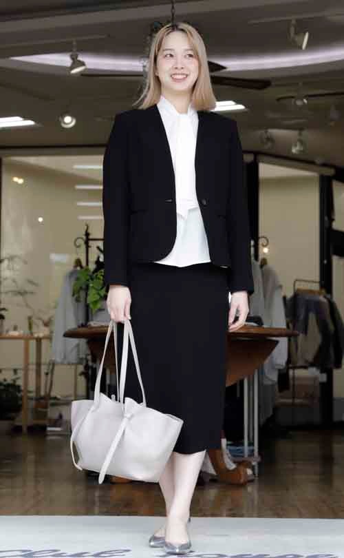 ノーカラージャケットとタイトスカートのセットアップスーツ
