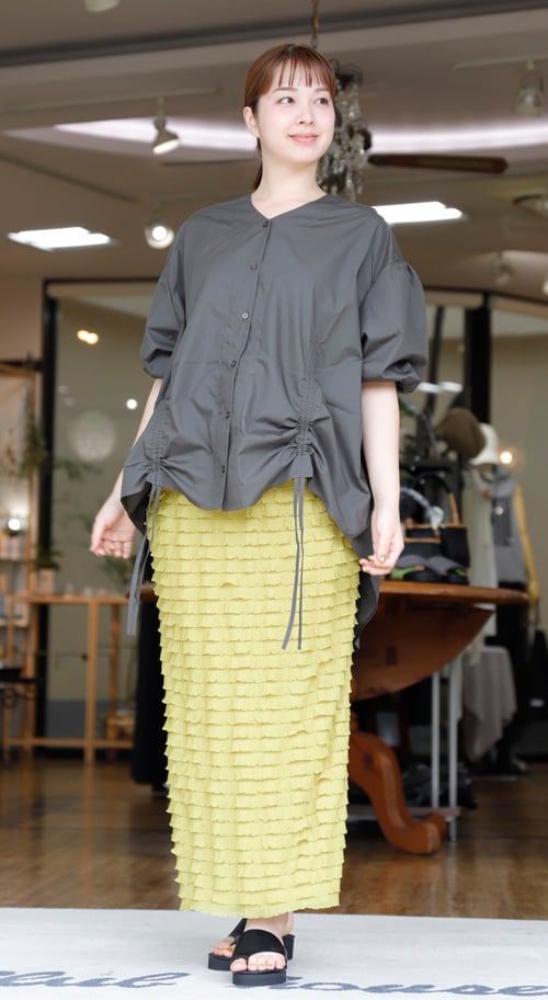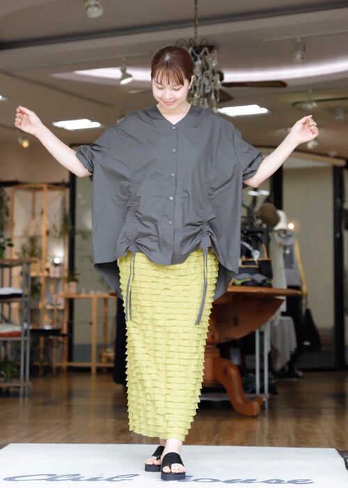 ※ご来店のお客様を優先させて頂きます。在庫確認の為に必ずクラブハウスへご連絡下さい(電話096-387-5570 メール[email protected])身頃ゆったりのシャツはふっくらバルーンスリーブ。裾のドロストをキュッと。形を変えて楽しめます。バックロングデザイン。ポリエステル・コットン。着丈の目安はスタッフの身長168cm。カーキ無地、パープルストライプ、グレーストライプ