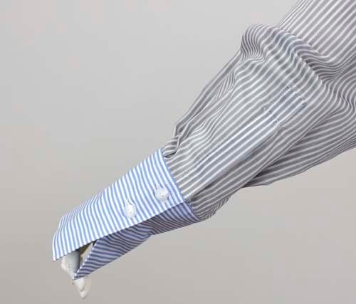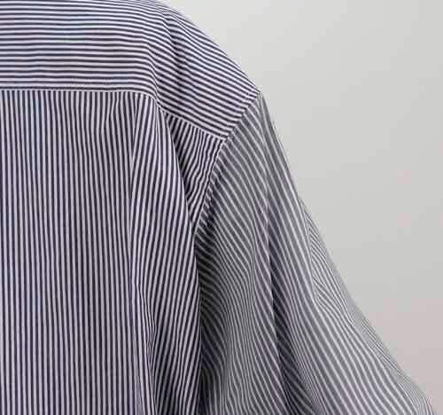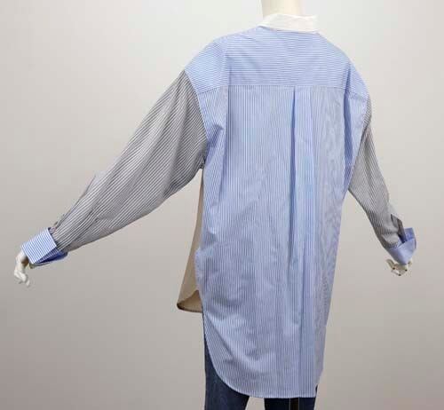 ※ご来店のお客様を優先させて頂きます。在庫確認の為に必ずクラブハウスへご連絡下さい(電話096-387-5570 メール[email protected]) 前身頃は無地で袖と背中にストライプのバックロングデザインシャツ。袖はシアー。身頃はコットン、シアーの袖はコットン・ポリエステル。ライトベージュにブルーストライプ、キャメルにネイビーストライプ