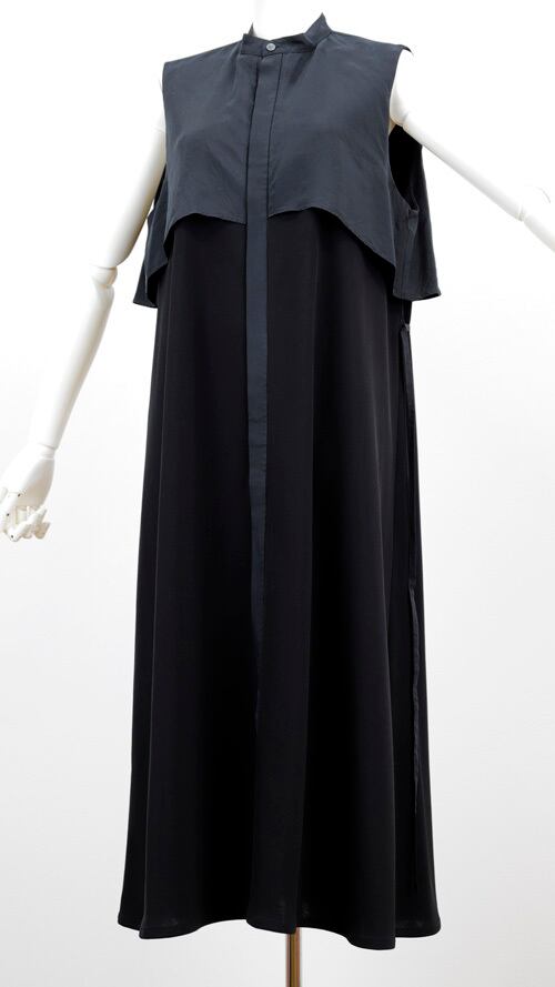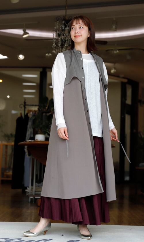 ※ご来店のお客様を優先させて頂きます。在庫確認の為に必ずクラブハウスへご連絡下さい(電話096-387-5570 メール[email protected])胸元にボレロベストドッキングデザインのロングベスト。柔らかでトロミあるトリアセテート・ポリエステル。フロントは隠しボタンの全開。ワンピースでもOK!共生地のベルト付き。着丈の目安はスタッフの身長168cm。カーキとグレーコンビ、ブラックとブラックコンビ