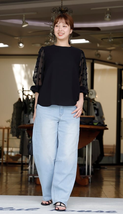 ※ご来店のお客様を優先させて頂きます。在庫確認の為に必ずクラブハウスへご連絡下さい(電話096-387-5570 メール[email protected])シアースリーブのブラウス。着丈の目安はスタッフの身長168cm。ネイビー、ブラック
