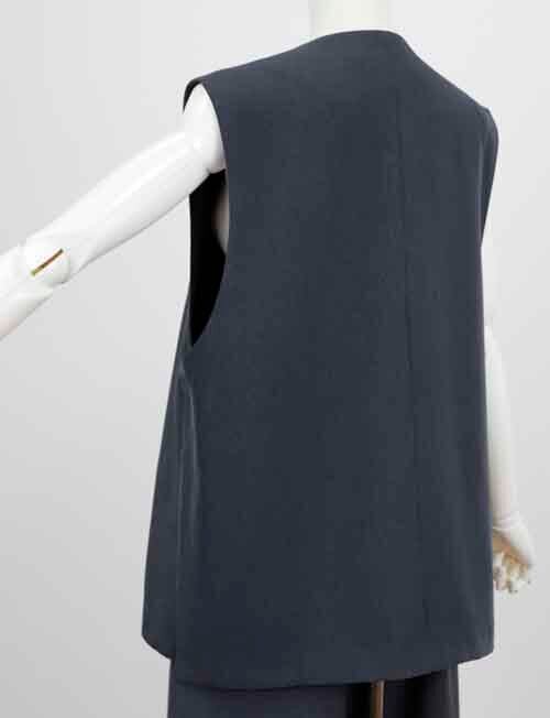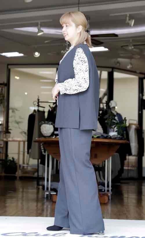※ご来店のお客様を優先させて頂きます。在庫確認の為に必ずクラブハウスへご連絡下さい(電話096-387-5570 メール[email protected])フロントのワンボタンと脇のボタンは包みボタンのベスト。タックプリーツのワイドパンツはウエストの後ろにゴムシャーリング。ポリエステル・ポリウレタン。グレー。お取り寄せカラーはブラウン、ブラック。着丈の目安はスタッフの身長168cm。
