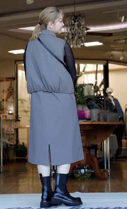 ※ご来店のお客様を優先させて頂きます。在庫確認の為に必ずクラブハウスへご連絡下さい(電話096-387-5570 メール[email protected])ポリエステルの中綿入り四角キルティングシリーズ。ベストとスカートとセットアップスーツになります。着丈の目安はスタッフの身長168cm。両脇に釦開き。ネックの後ろにファスナー開き。3カラー(グレー、ブラック、アイボリー