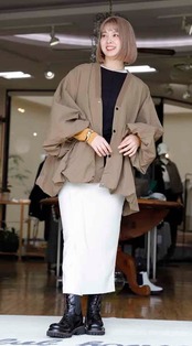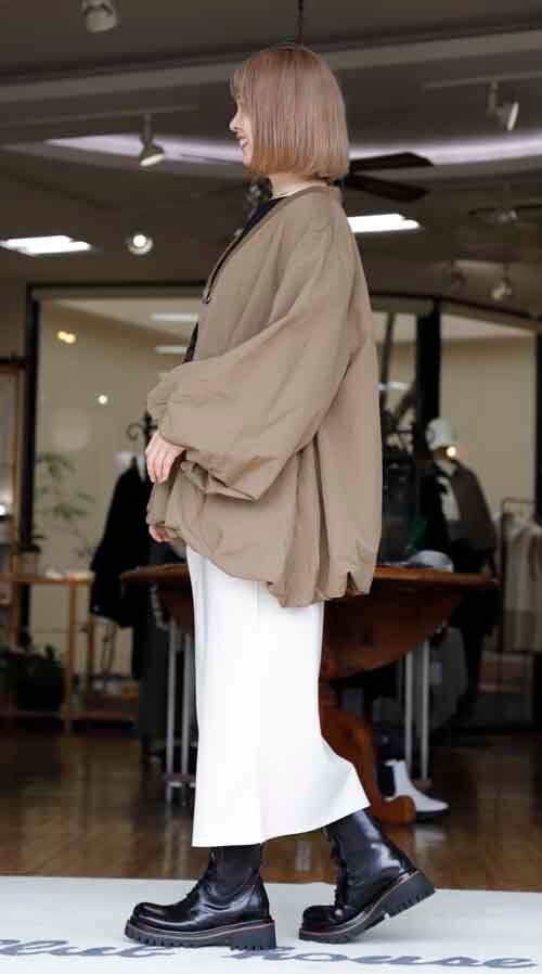 ※ご来店のお客様を優先させて頂きます。在庫確認の為に必ずクラブハウスへご連絡下さい(電話096-387-5570 メール[email protected]) 袖も裾もふっくらバルーンシルエットのVネックショートコート。ポリエステル・ナイロン。袖口も裾もゴムシャーリング。着丈の目安はスタッフの身長168cm。4カラー(モカ、チョコ、グレー、ブラック