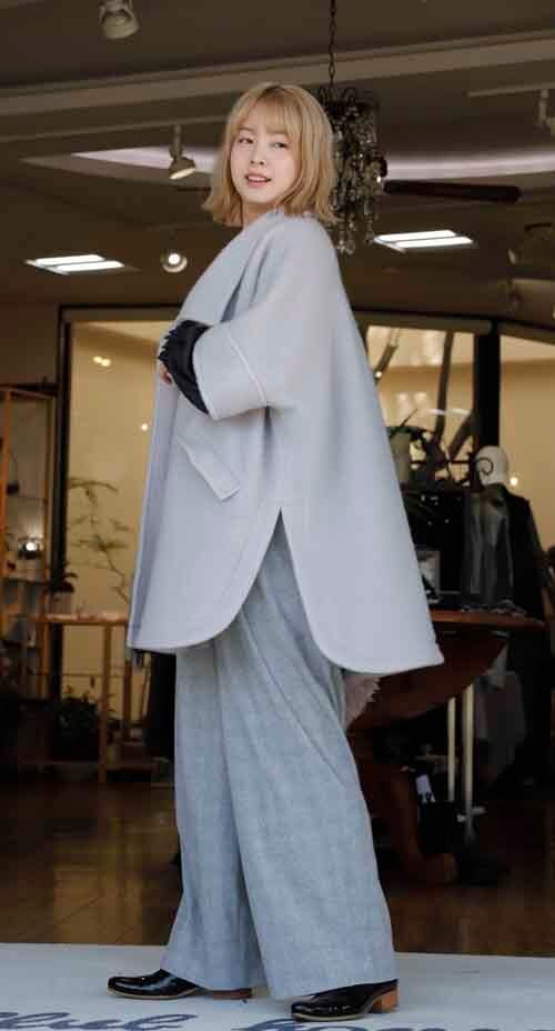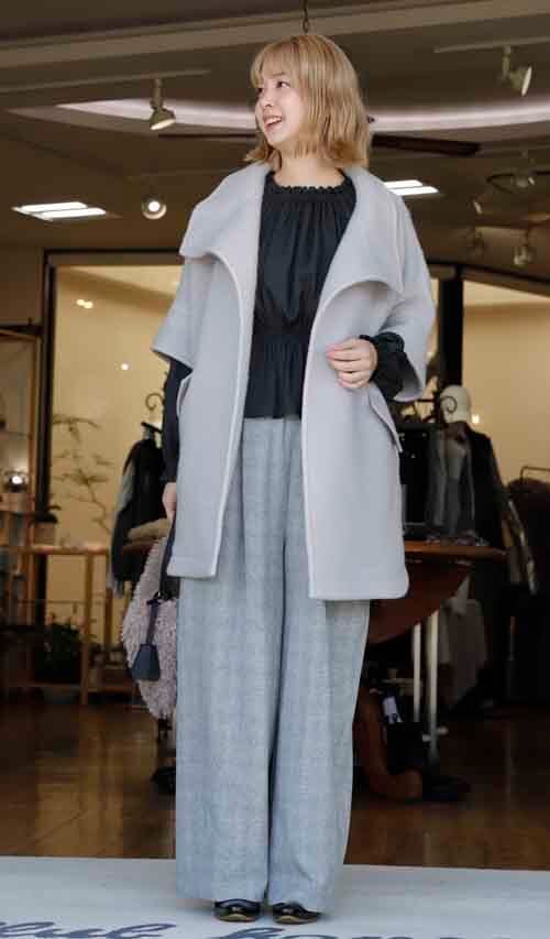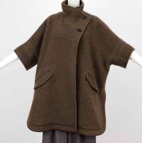 ※ご来店のお客様を優先させて頂きます。在庫確認の為に必ずクラブハウスへご連絡下さい(電話096-387-5570 メール[email protected])両脇にラウンドスリットのウール混紡ジャコットはアシメトリー釦のハイネック。ウール・ポリエステル。ボタンを開けてショールカラー風に。ライトグレー、チョコ