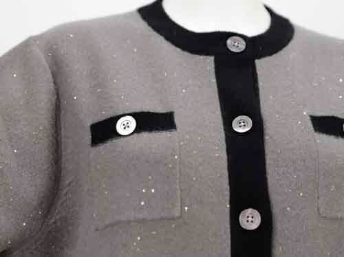 ※ご来店のお客様を優先させて頂きます。在庫確認の為に必ずクラブハウスへご連絡下さい(電話096-387-5570 メール[email protected])ほんのり煌めくスパンコール入りニットジャケット。ウール・ポリエステル。着丈の目安はスタッフの身長168cm。グレーにはブラックのパイピング、ブラックにはグレーのパイピング