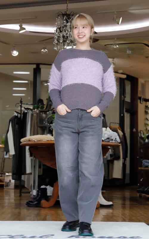 ※ご来店のお客様を優先させて頂きます。在庫確認の為に必ずクラブハウスへご連絡下さい(電話096-387-5570 メール[email protected])透かし編みセーターと糸フリンジのバイカラーセーター。ポリエステル・アクリル。着丈の目安はスタッフの身長168cm。イエローとオフホワイト、チャコールとラベンダー、ブラックとブラウン、ライトグレーとグレー