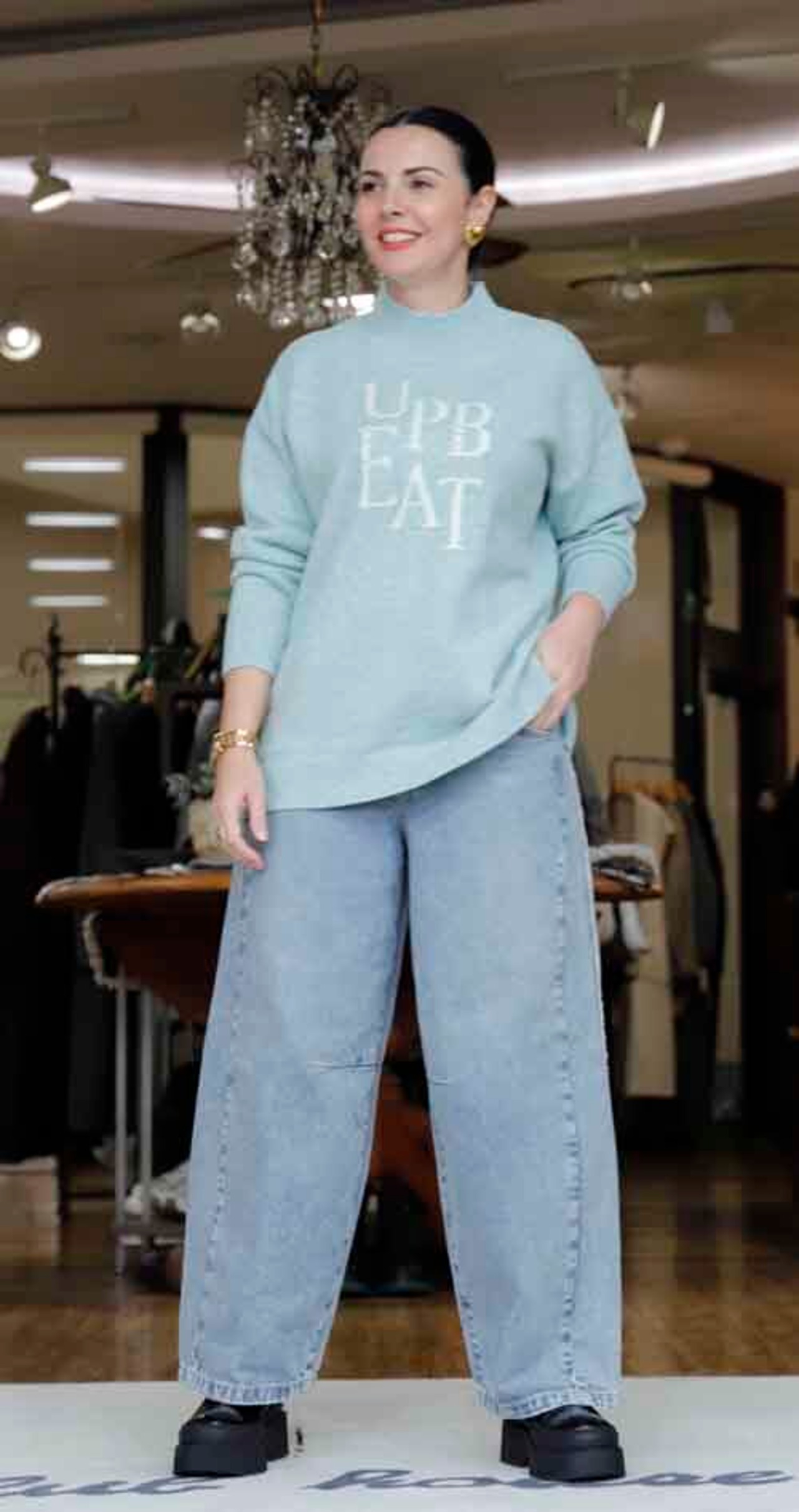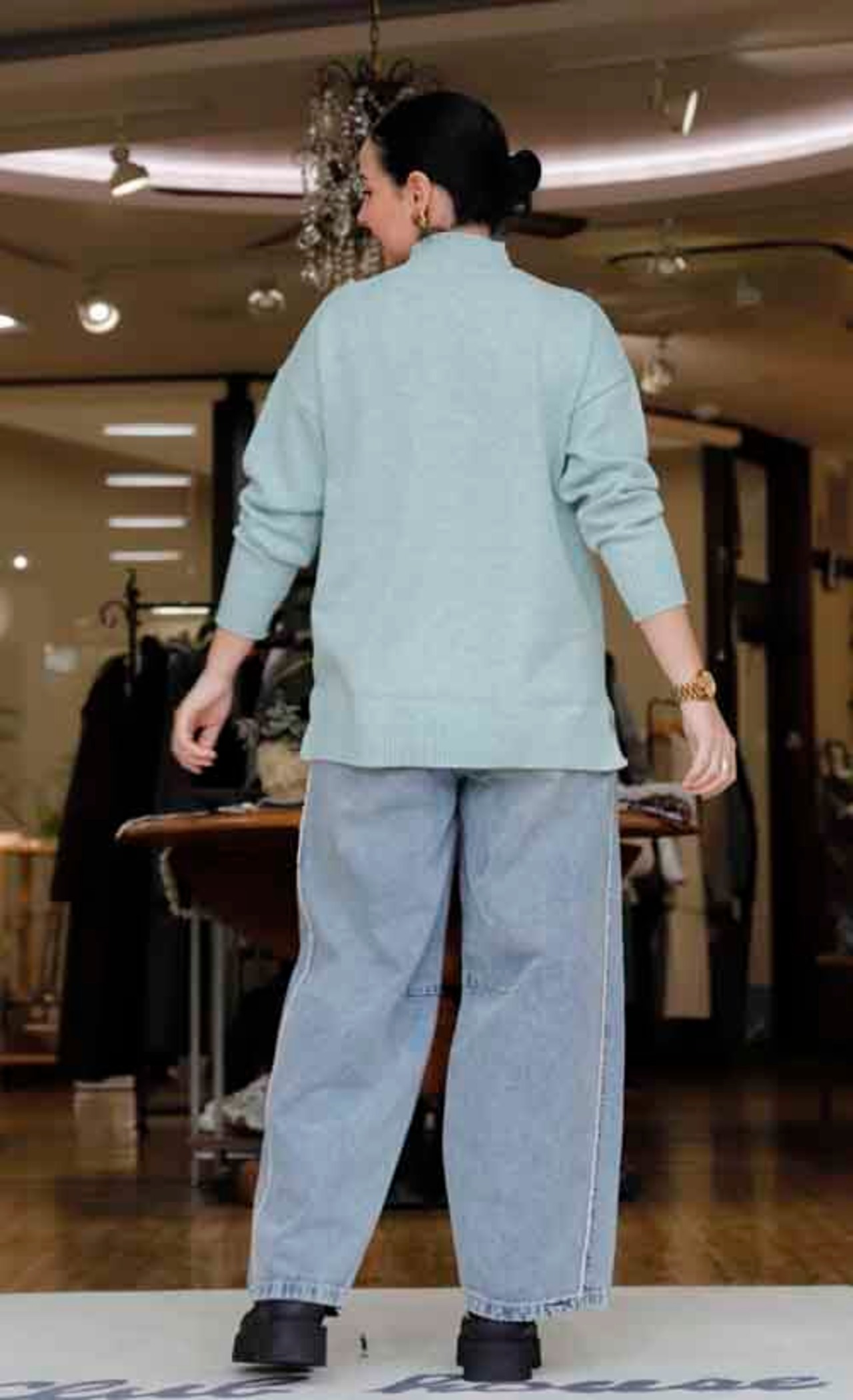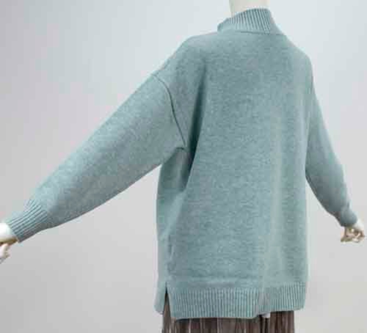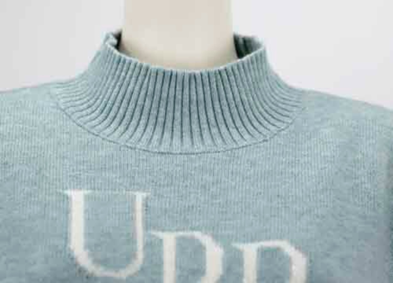 ※ご来店のお客様を優先させて頂きます。在庫確認の為に必ずクラブハウスへご連絡下さい(電話096-387-5570 メール[email protected])胸元のロゴにビジュー付きモックネックセーター。着丈の目安はスタッフの身長159cm。ポリエステル・アクリル・ナイロン。3カラー(ミント、ネイビー、アイボリー
