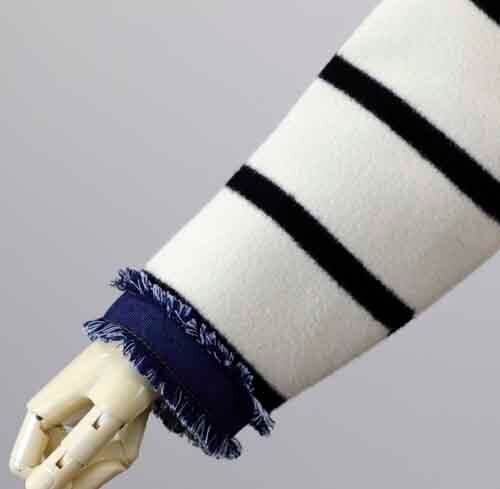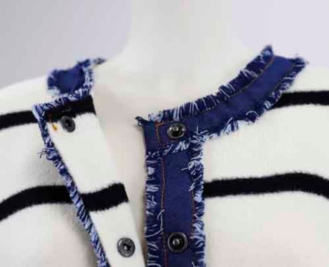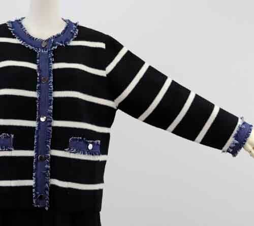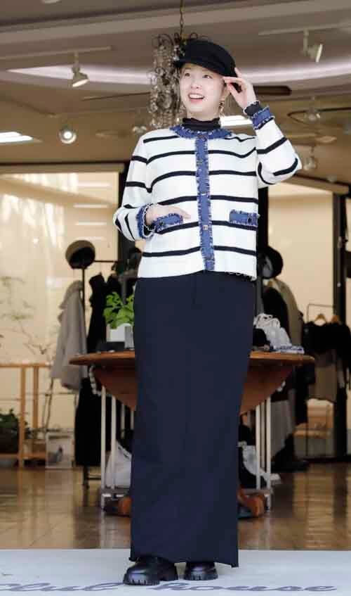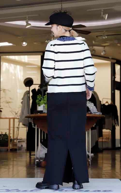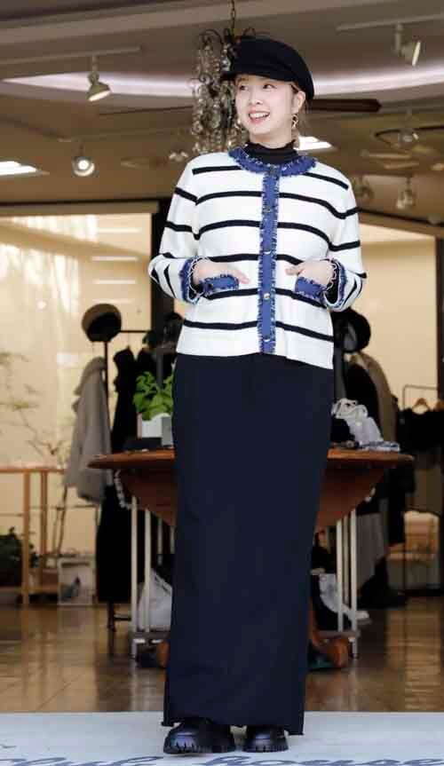 ※ご来店のお客様を優先させて頂きます。在庫確認の為に必ずクラブハウスへご連絡下さい(電話096-387-5570 メール[email protected])コンパクトなボーダーカーディガンはデニムコンビ。ポリエステル・レーヨン。コートのインでも邪魔しない大きさ。着丈の目安はスタッフの身長168cm。オフホワイトにブラックボーダー、ブラックにオフホワイトボーダー