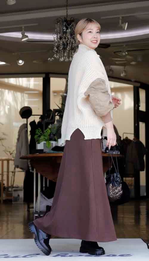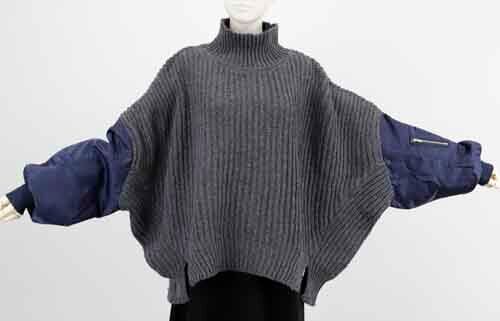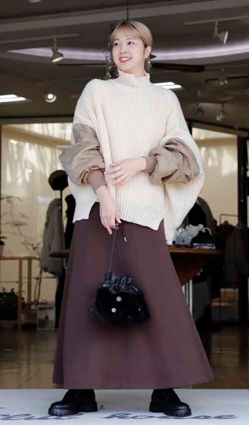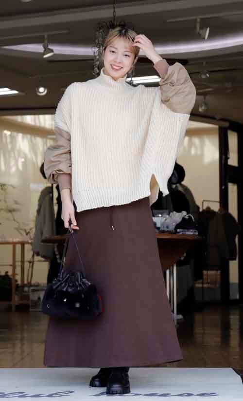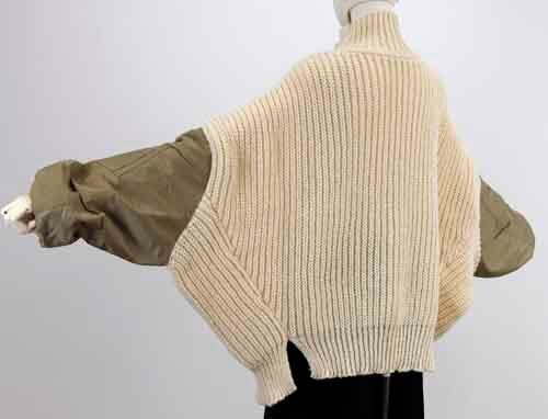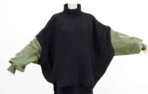※ご来店のお客様を優先させて頂きます。在庫確認の為に必ずクラブハウスへご連絡下さい(電話096-387-5570 メール[email protected])やや透け感あるゆったりシルエットのセーターにミリタリー袖のドッキング。リブのハイネックはゆるり。アクリル・ポリエステル。ミリタリー袖はナイロン。着丈の目安はスタッフの身長168cm。ベージュにキャメルの袖、チャコールにネイビー袖、ブラックにはカーキ袖