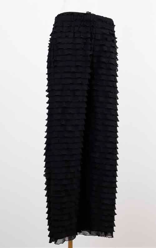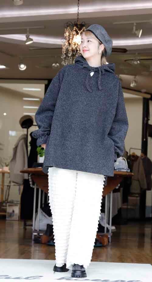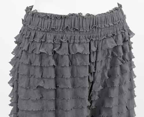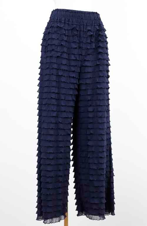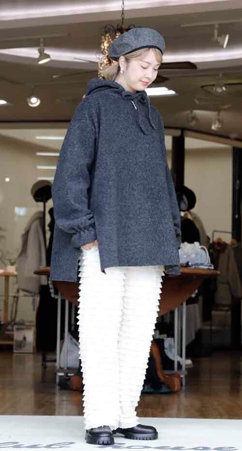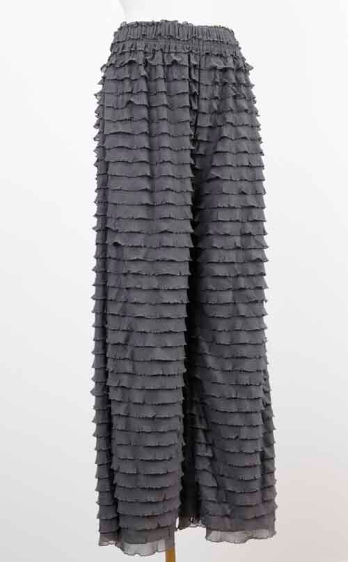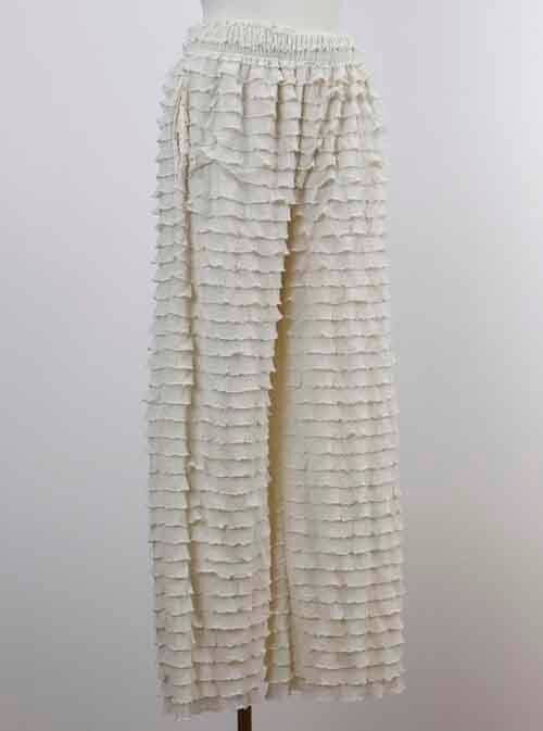 ※ご来店のお客様を優先させて頂きます。在庫確認の為に必ずクラブハウスへご連絡下さい(電話096-387-5570 メール[email protected]) さっと穿けるゴムシャーリングウエストのパンツはふりふりデザイン。ポリエステル・ポリウレタン。着丈の目安はスタッフの身長168cm。アイボリー、グレー、ネイビーブラック