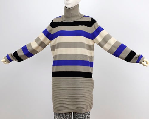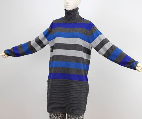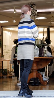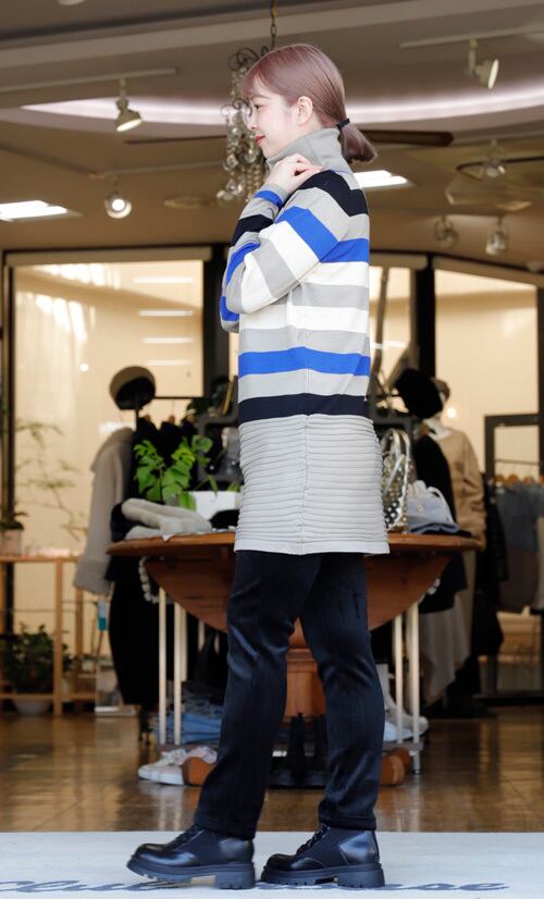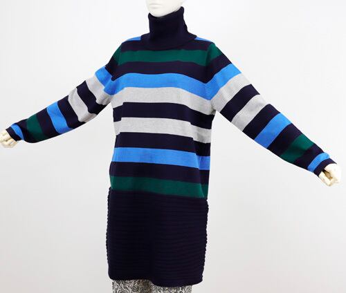 ※ご来店のお客様を優先させて頂きます。在庫確認の為に必ずクラブハウスへご連絡下さい(電話096-387-5570 メール[email protected]) タートルネックのマルチボーダーチュニック。レーヨン・ポリエステルのハイゲージニット。着丈の目安はスタッフの身長168cm。ネックのカラーと肩のカラーはAベージュとネイビー Bグレーとブルー Cチャコールとラベンダー Dネイビーとブルー Eブラックとベージュ