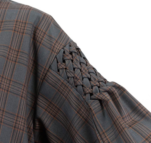 ※ご来店のお客様を優先させて頂きます。在庫確認の為に必ずクラブハウスへご連絡下さい(電話096-387-5570 メール[email protected])アウター兼用シャツワンピース。ポリエステル・レーヨン。ふっくら袖の肩には編み込みデザイン。着丈の目安はスタッフの身長168cm。グレーにイエローチェック、チャコールにオレンジチェック