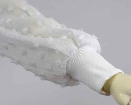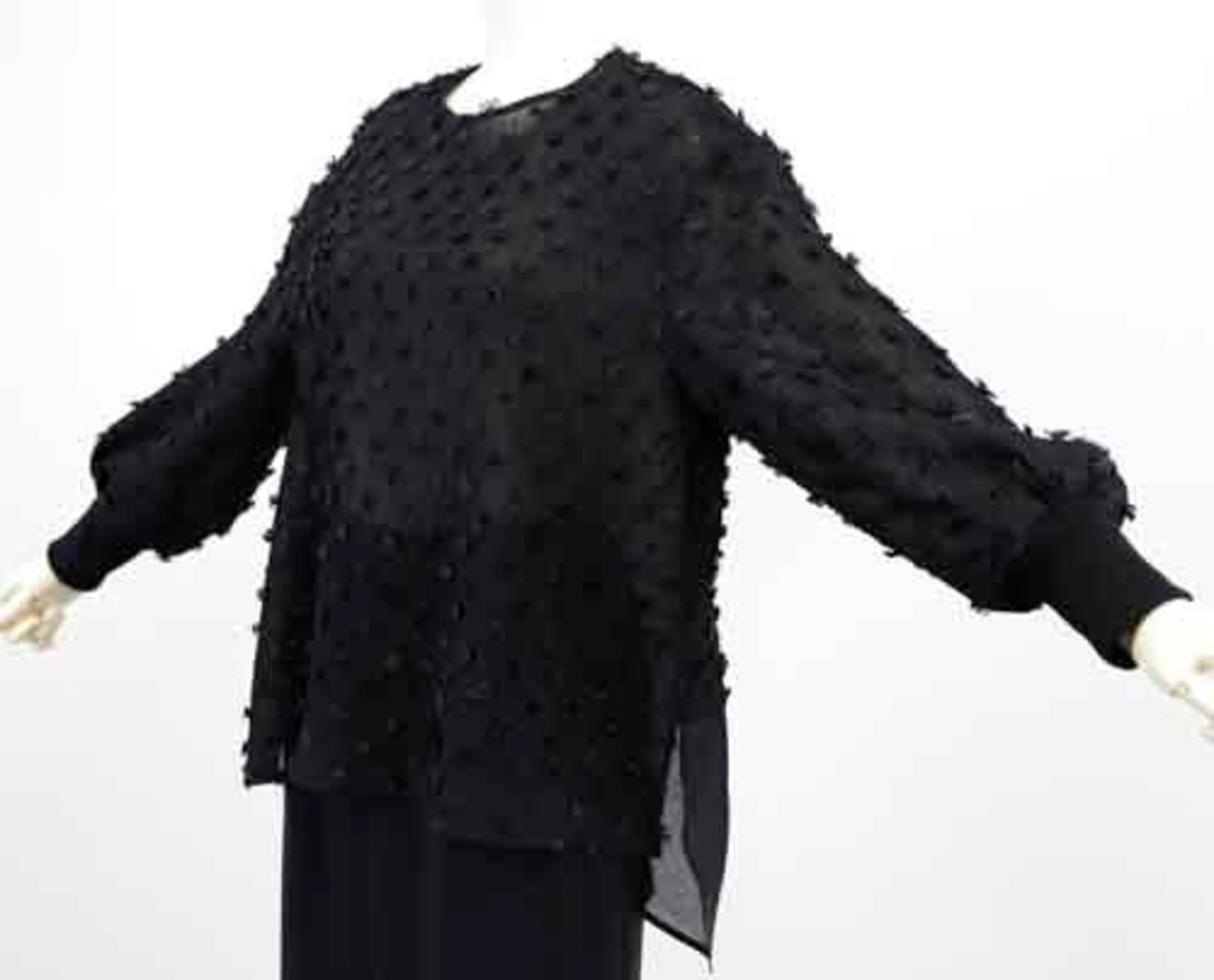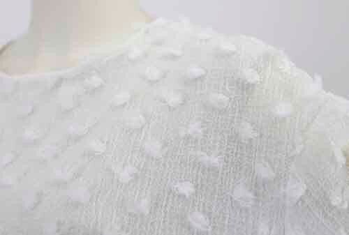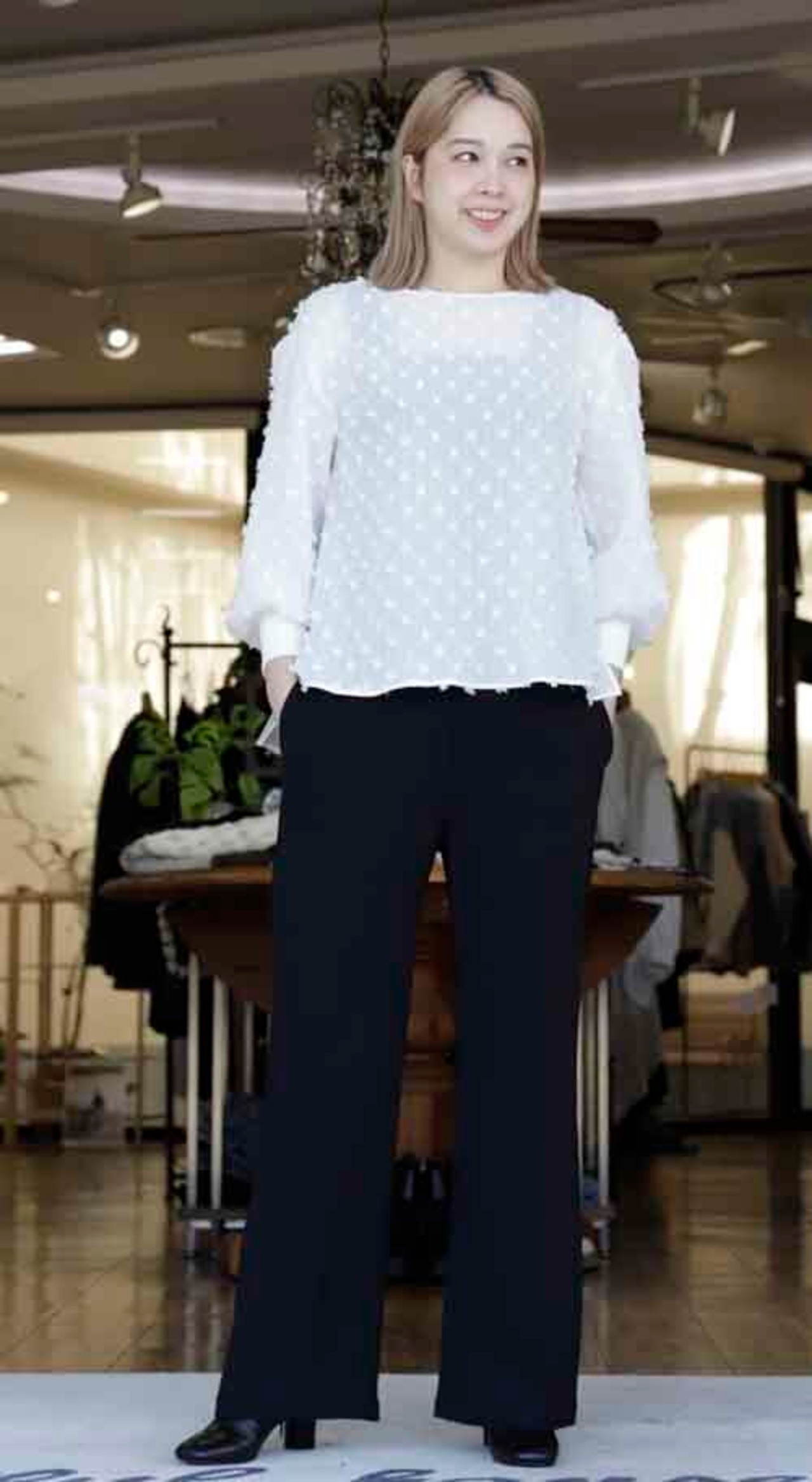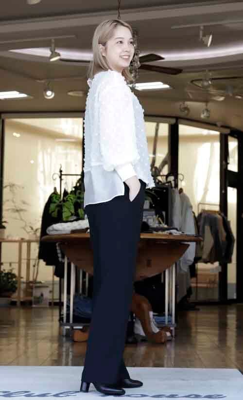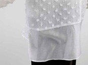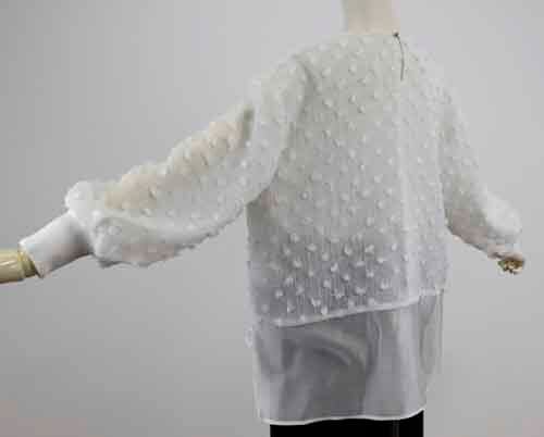 ※ご来店のお客様を優先させて頂きます。在庫確認の為に必ずクラブハウスへご連絡下さい(電話096-387-5570 メール[email protected]) 背中の裾はシフォンコンビのブラウス。身頃はクシュクシュのシュリンクで小さなタッセルのドット風デザイン。着丈の目安はスタッフの身長168cm。ホワイト、ブラック