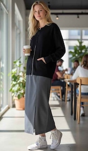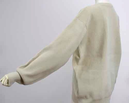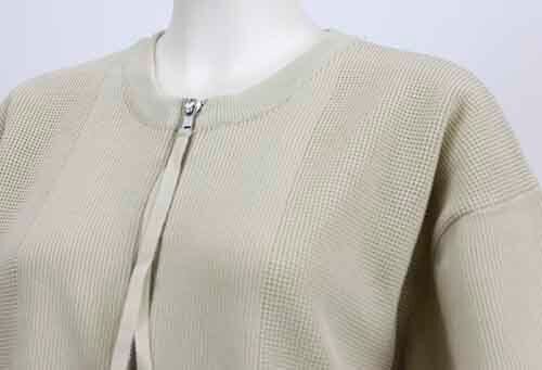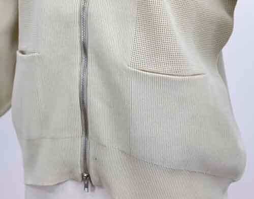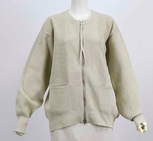 ダイバーニットのカーディガン。フロントは上下に開閉のダブルファスナー。両脇にポケット。