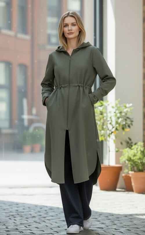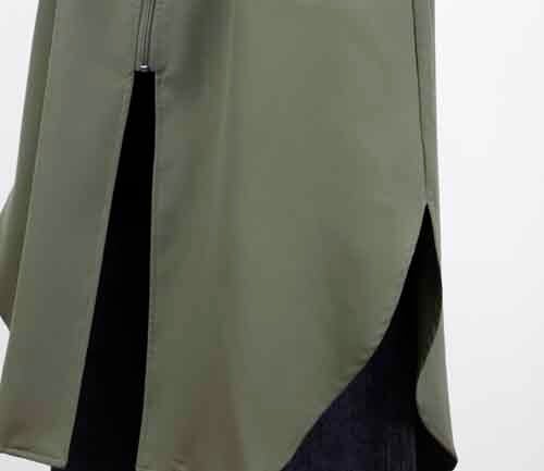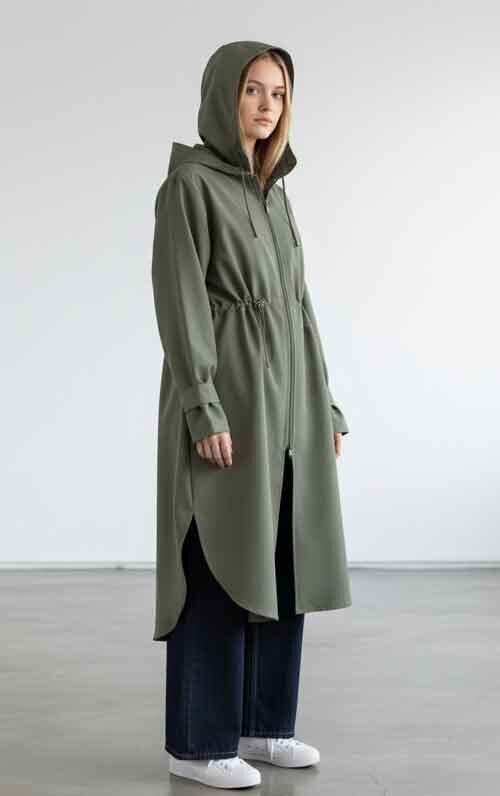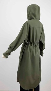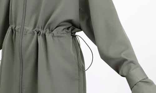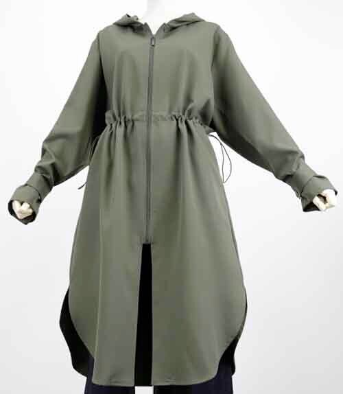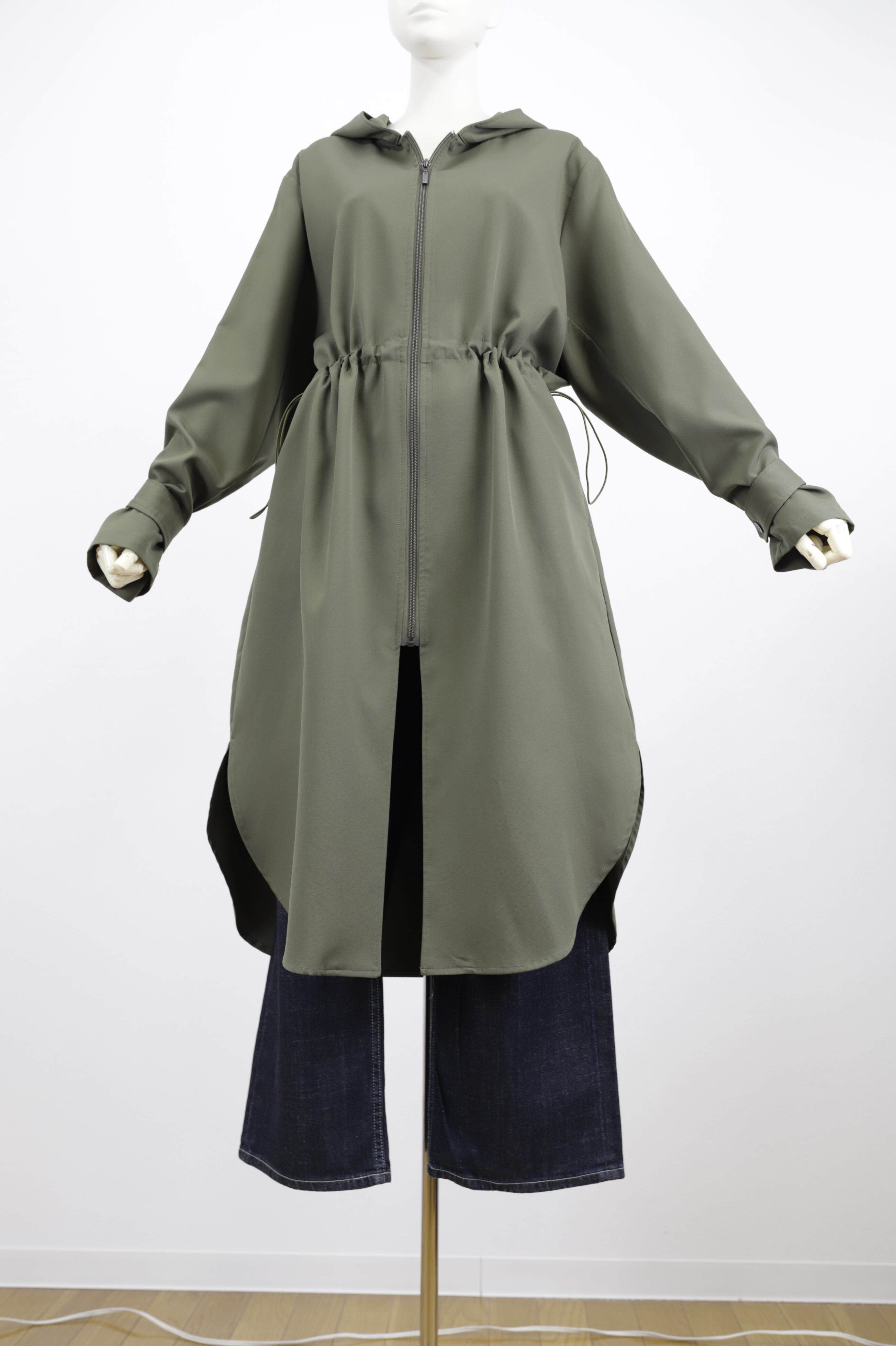 ※ご来店のお客様を優先させて頂きます。在庫確認の為に必ずクラブハウスへご連絡下さい(電話096-387-5570 メール[email protected]) フロントはファスナー開きのパーカコート。着丈110cm。ポリエステル・ポリウレタン。腰高位置でドロストデザイン。かーき
