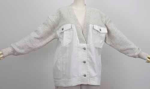 ※ご来店のお客様を優先させて頂きます。在庫確認の為に必ずクラブハウスへご連絡下さい(電話096-387-5570 メール[email protected])カラミ編みニットカーディガンにデニムのドッキングデザイン。着丈の目安はスタッフの身長168cm。2カラー(ホワイト、ブルー