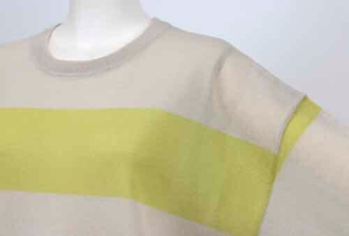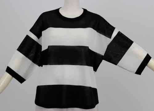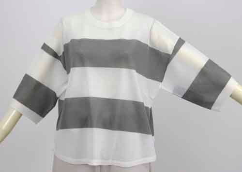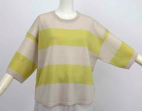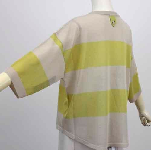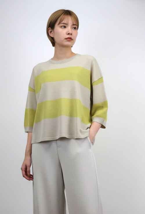 ※ご来店のお客様を優先させて頂きます。在庫確認の為に必ずクラブハウスへご連絡下さい(電話096-387-5570 メール[email protected])太いボーダーのゆるシルエットのシアーセーターです。アクリル・ポリエステル。ドロップショルダーで肘の隠れる袖丈。4カラー(ベージュにピスタチオボーダー、オフホワイトにワインボーダー、オフホワイトにグレーボーダー、ブラックにホワイトボーダー