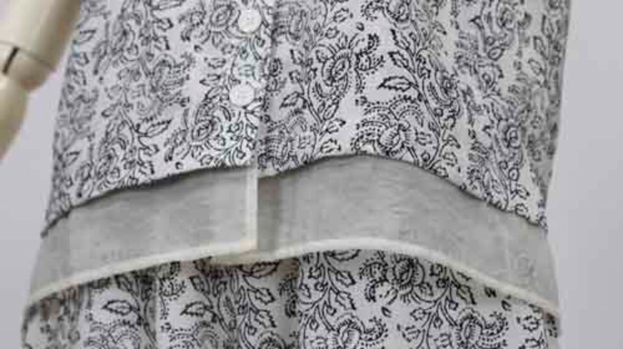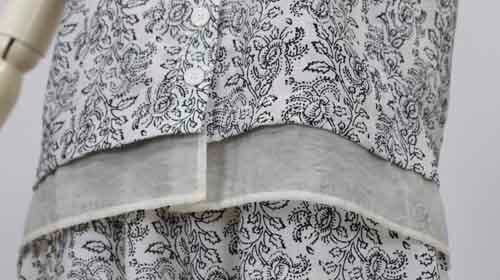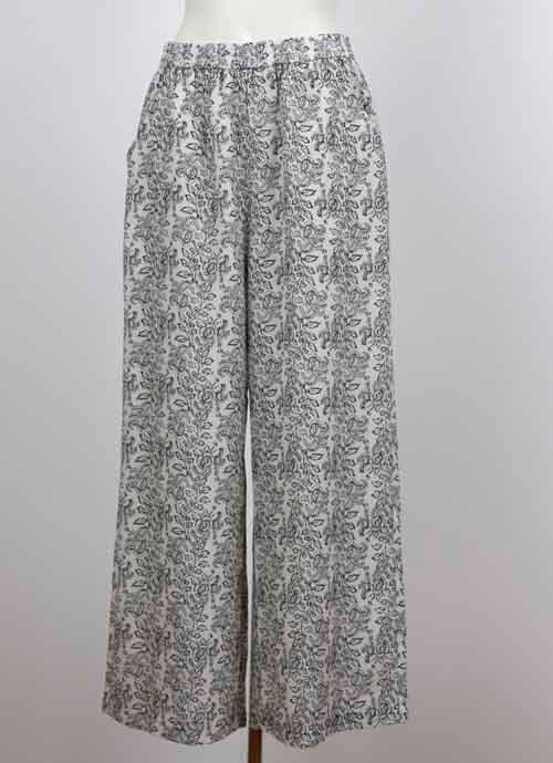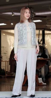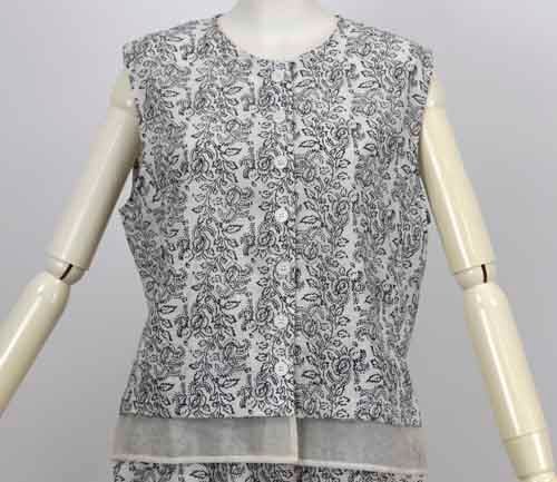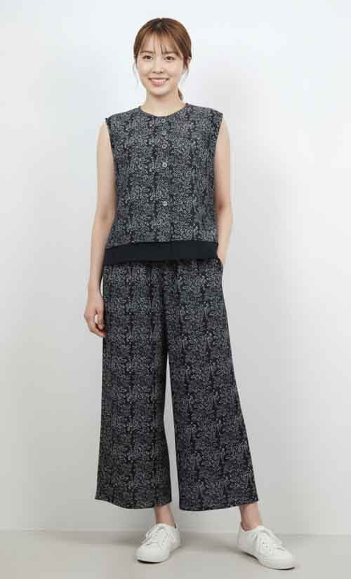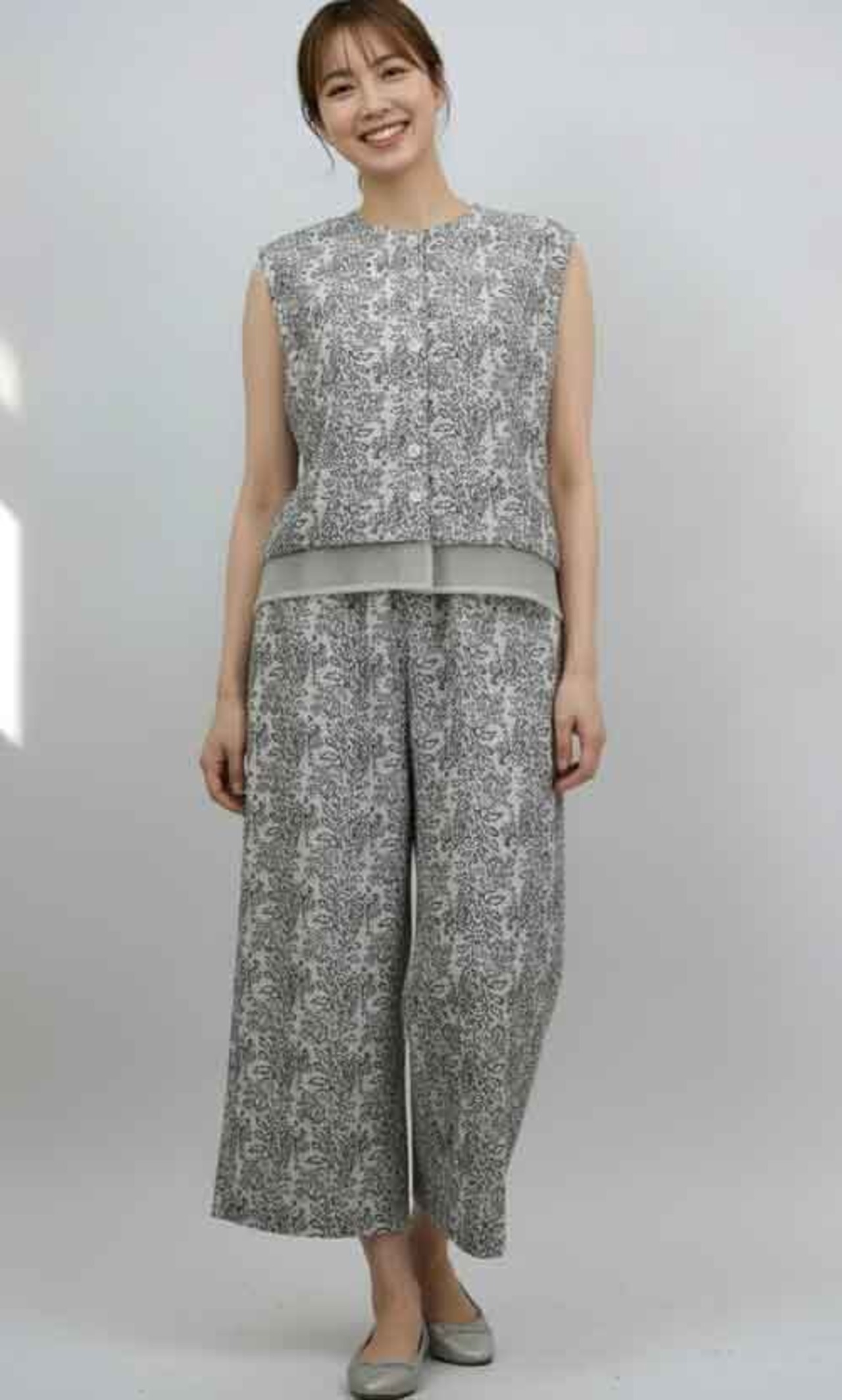 ※ご来店のお客様を優先させて頂きます。在庫確認の為に必ずクラブハウスへご連絡下さい(電話096-387-5570 メール[email protected]) モノトーンプリントのノースリーブブラウスとパンツのセットアップスーツ。ポリエステル。ベストの裾はテンセル・ポリエステルのシアー。パンツはさっと穿けるゴムシャーリングウエスト。2カラー(ライトベージュ、ブラック