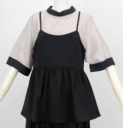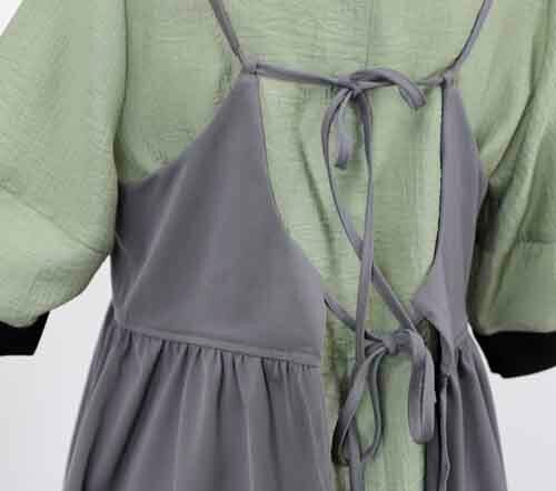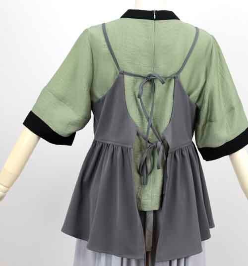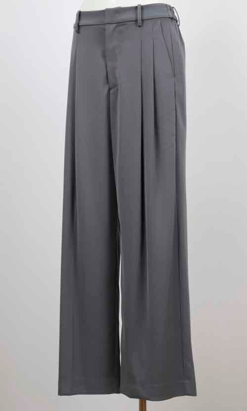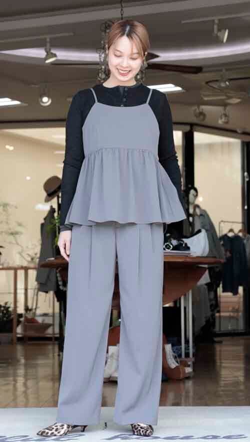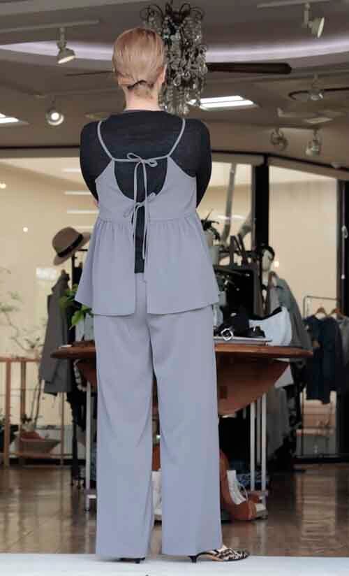 ※ご来店のお客様を優先させて頂きます。在庫確認の為に必ずクラブハウスへご連絡下さい(電話096-387-5570 メール[email protected])背中にリボン結びのビスチェとタックプリーツのトラウザーパンツのセットアップスーツ。スタッフの身長168cm。ビスチェとパンツはサイズありません。グレー、ブラック